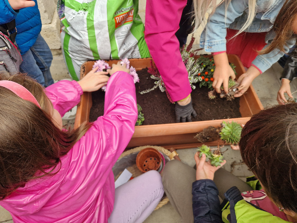 - I bambini delle elementari, in un clima di entusiasmo e animazione, hanno usato le mani nella terra per un gesto simbolico e significativo: hanno piantato fiori in due grandi vasi, posizionati poi all’esterno delle nostre due chiese. Quei fiori rappresentano la cura dell’ambiente in cui vivono.